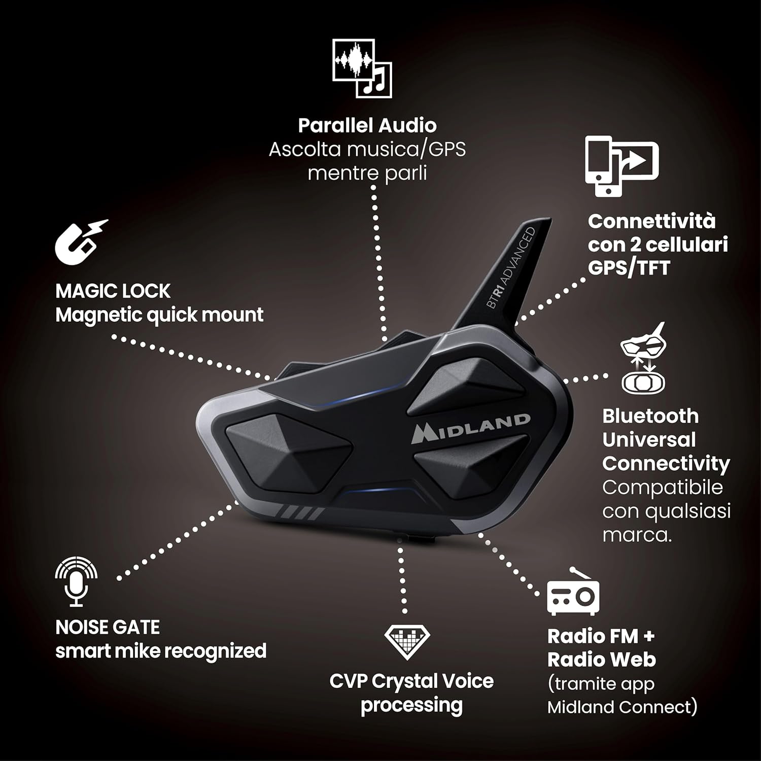 Il BTR1 ADVANCED, l'ultimo interfono di punta della gamma, introduce una funzionalità "PARALLEL AUDIO" che porta la comunicazione e l'intrattenimento su due ruote a un livello senza precedenti, offrendoti un'esperienza unica in termini di comfort, sicurezza e piacere di guida. Una vera innovazione in casa Midland per un modello con singolo processore.