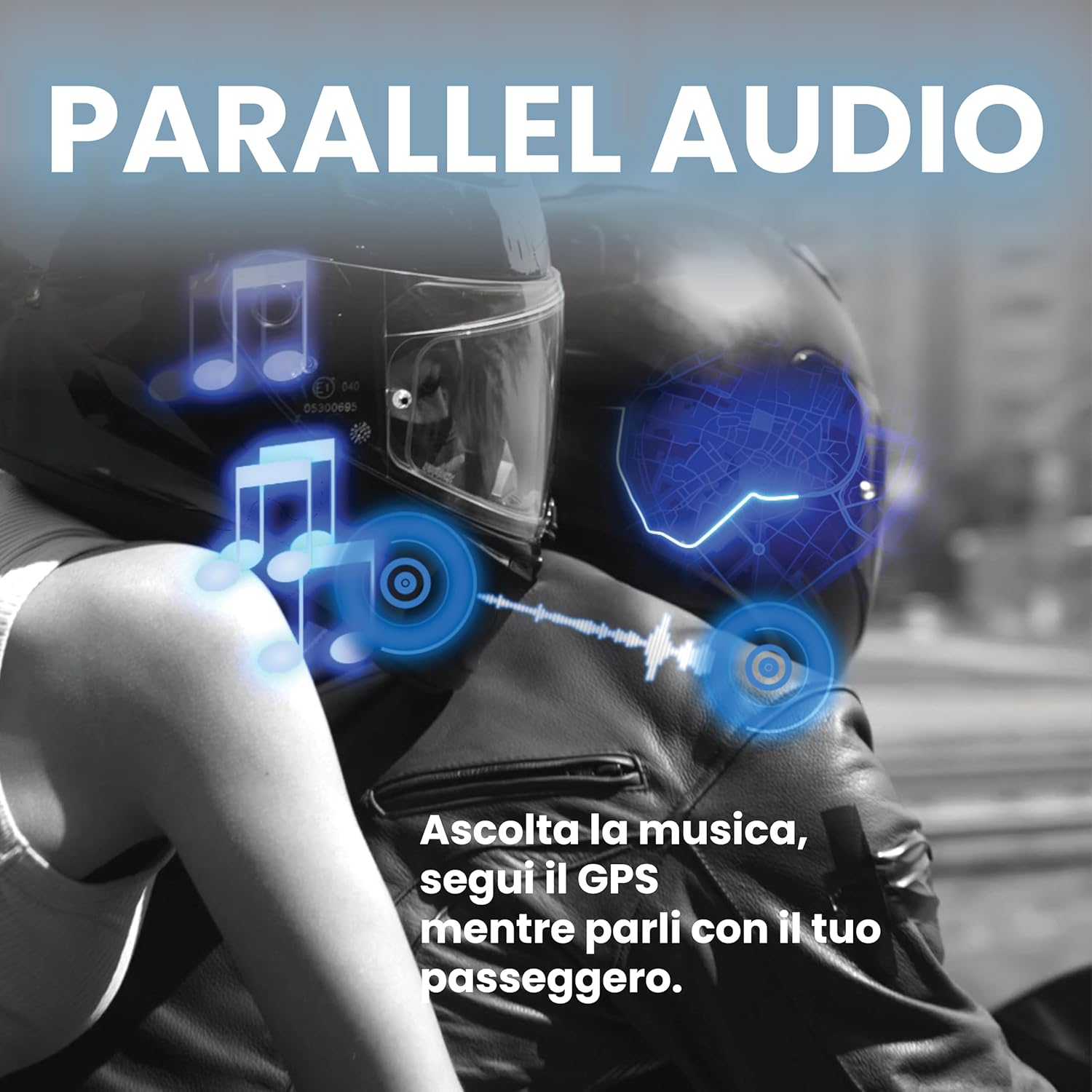 Con "PARALLEL AUDIO", potrai finalmente dire addio alle fastidiose interruzioni che spesso si verificano durante l'uso simultaneo di più sorgenti audio. Potrai conversare in modalità interfono con il tuo compagno di viaggio e, nel sottofondo, ascoltare le indicazioni delle App Gps e della tua Playlist preferita.